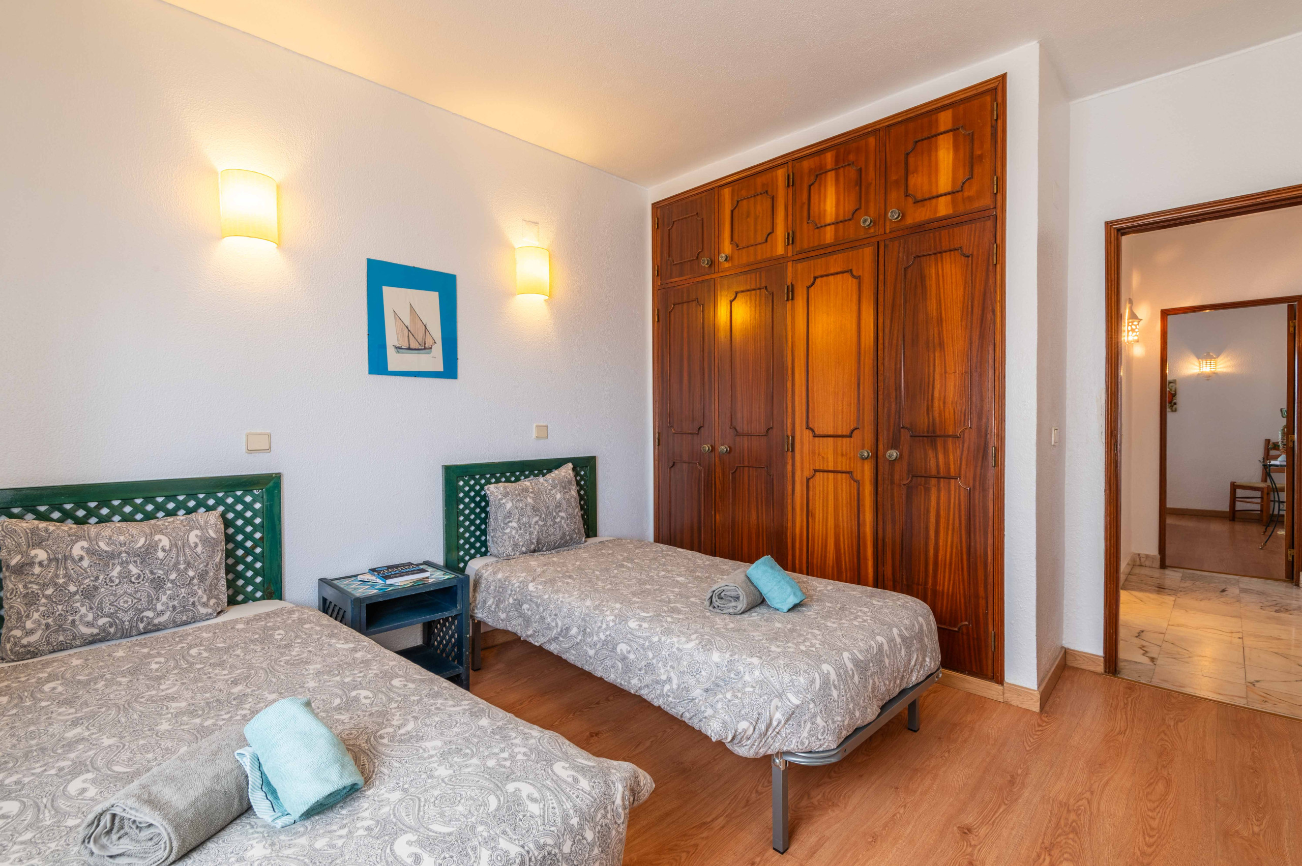 The rooms, both with two single beds each, wardrobes with hangers, air conditioning and small balcony. Between the rooms is the bathroom with bathtub, washbasin, bidet and hair dryer.