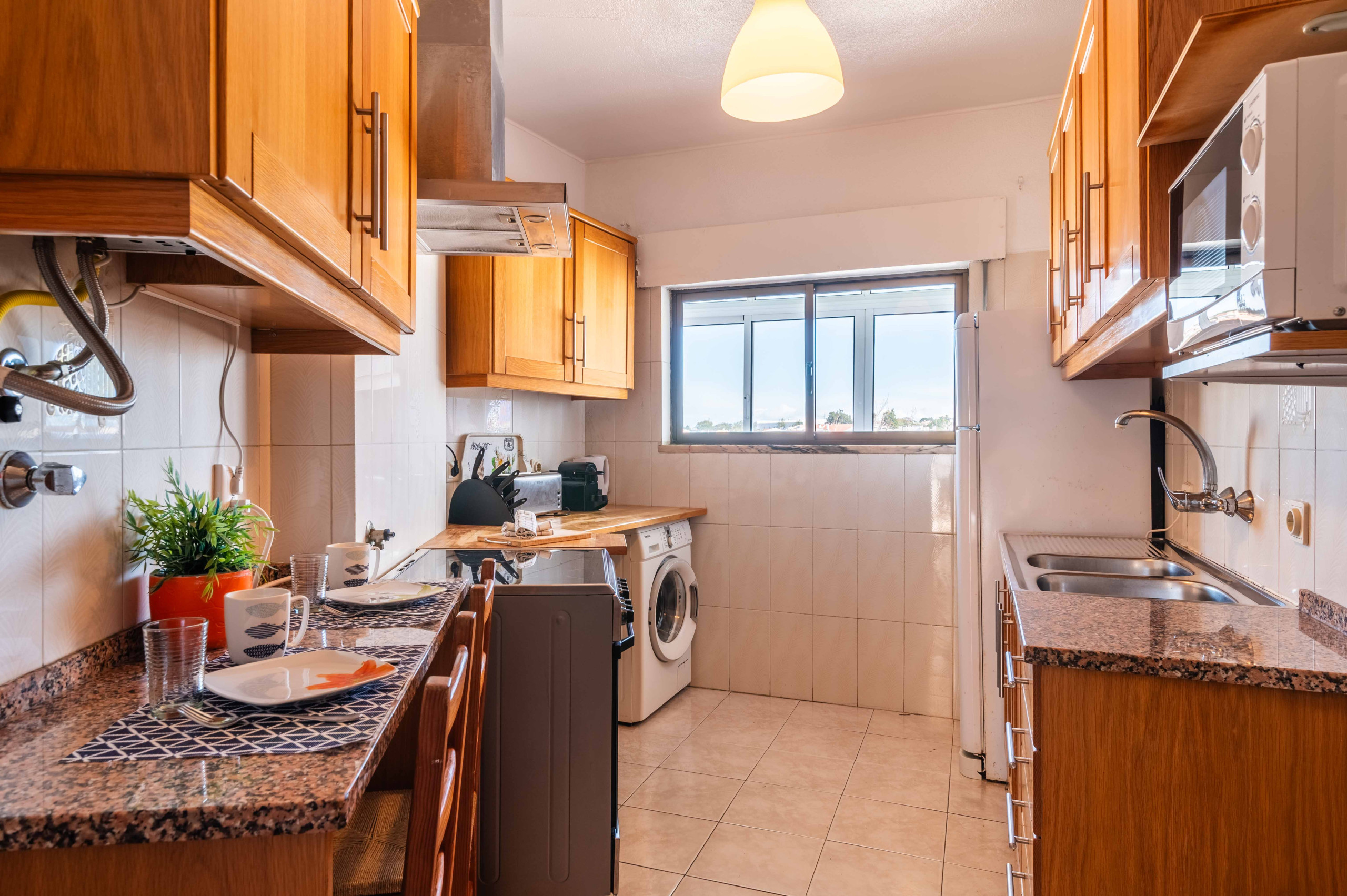 The kitchen is very functional and completely equipped with the following appliances: fridge, freezer, hob with 4 burners, electric oven, capsule and filter coffee machine, toaster, kettle, microwave, juice machine and washing machine.